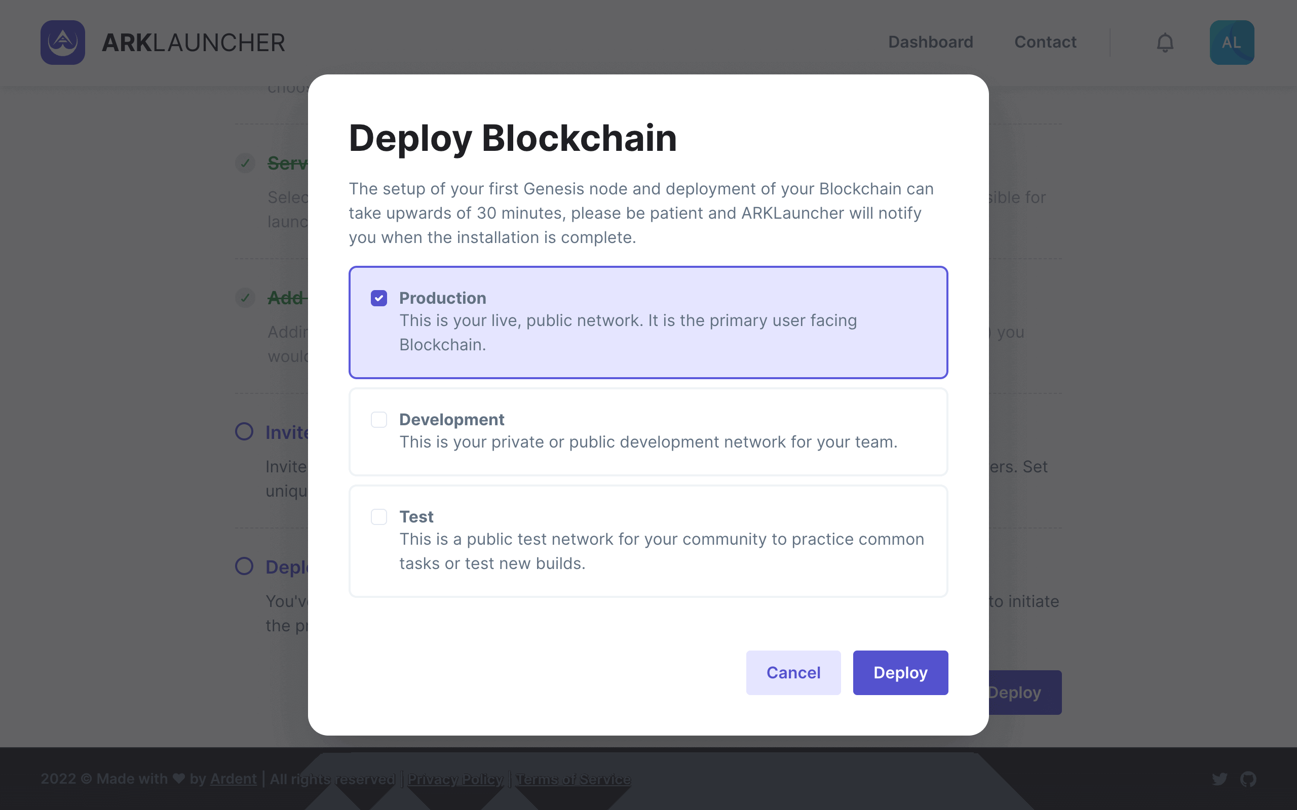 The Deploy Blockchain modal will appear. Here you will need to select one of the three network types in order to finalize the process.