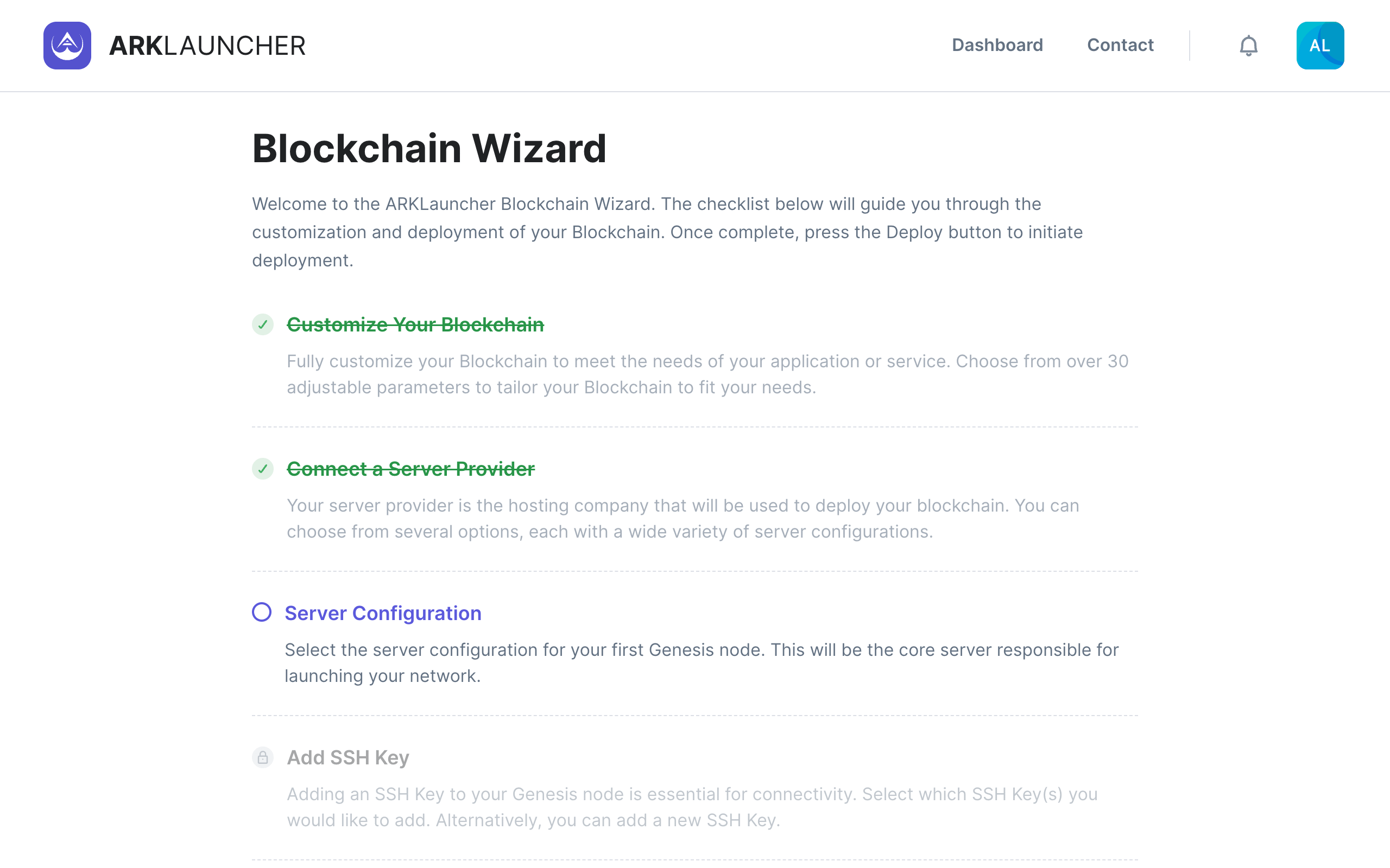 While viewing the Blockchain Wizard, you will notice a strikethrough across the Customize Your Blockchain and Connect a Server Provider steps. In order to select a server configuration for your blockchain, you will need to click on Server Configuration.
